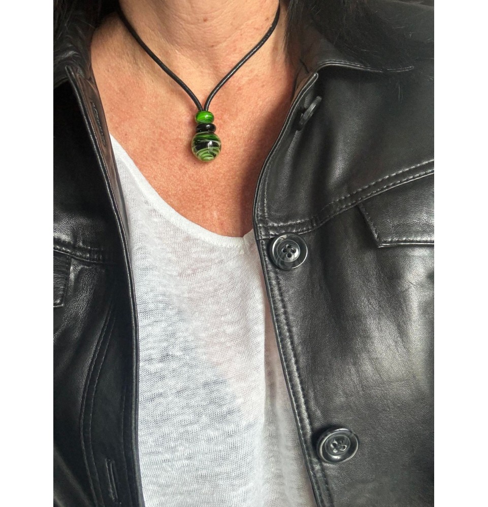 Collier en cuir avec perles de verre filé "noir vert rosetta" 45+3 cm