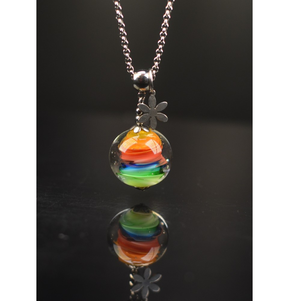 Collier "multicolore" en Perles de Verre et acier inoxydable, breloque fleur