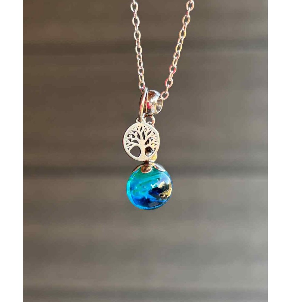 collier arbre de vie 45 +3 cm "bleu vert" perles de verre filé au chalumeau