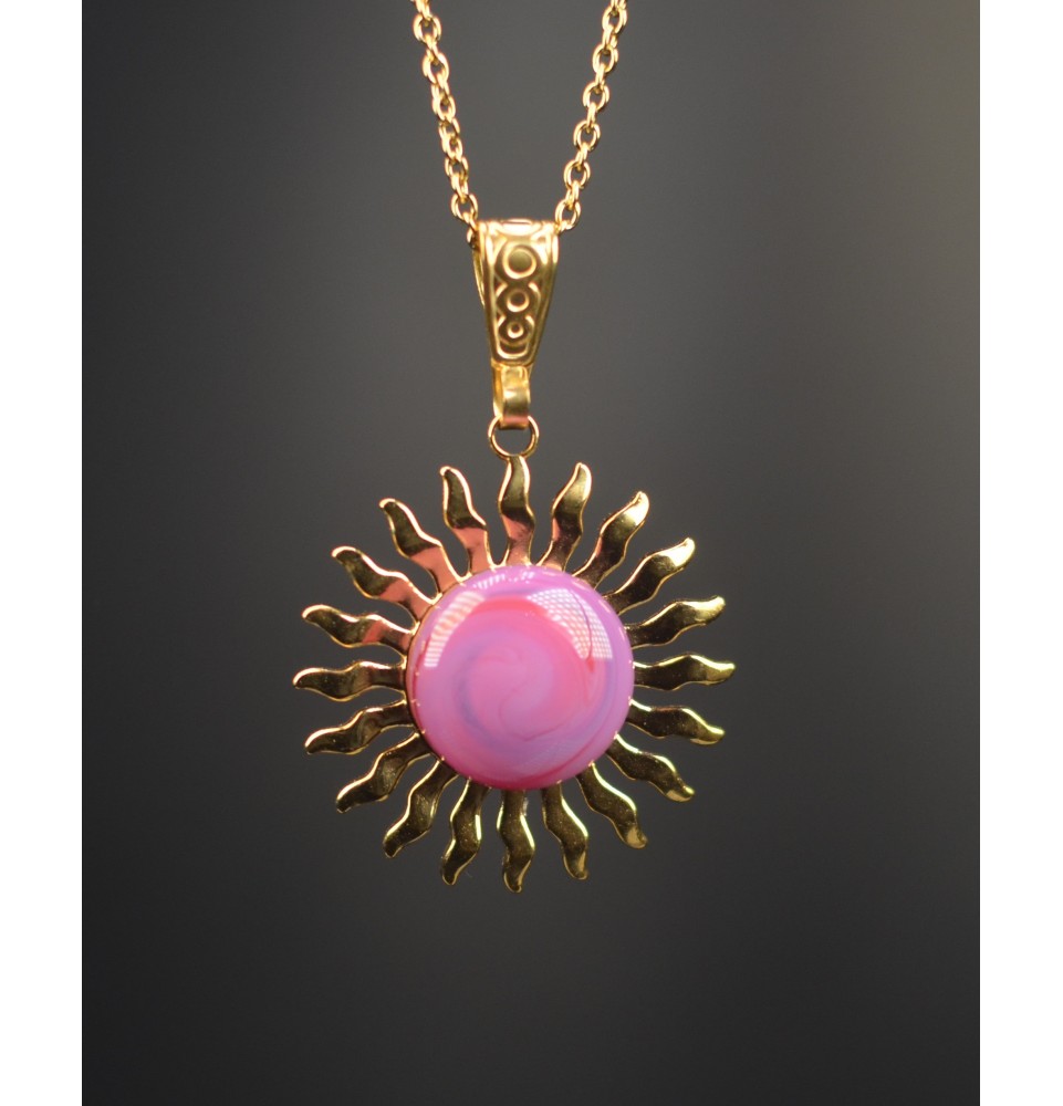 Collier Soleil – Cabochon en verre violet rosé - ACIER INOXYDABLE DORE
