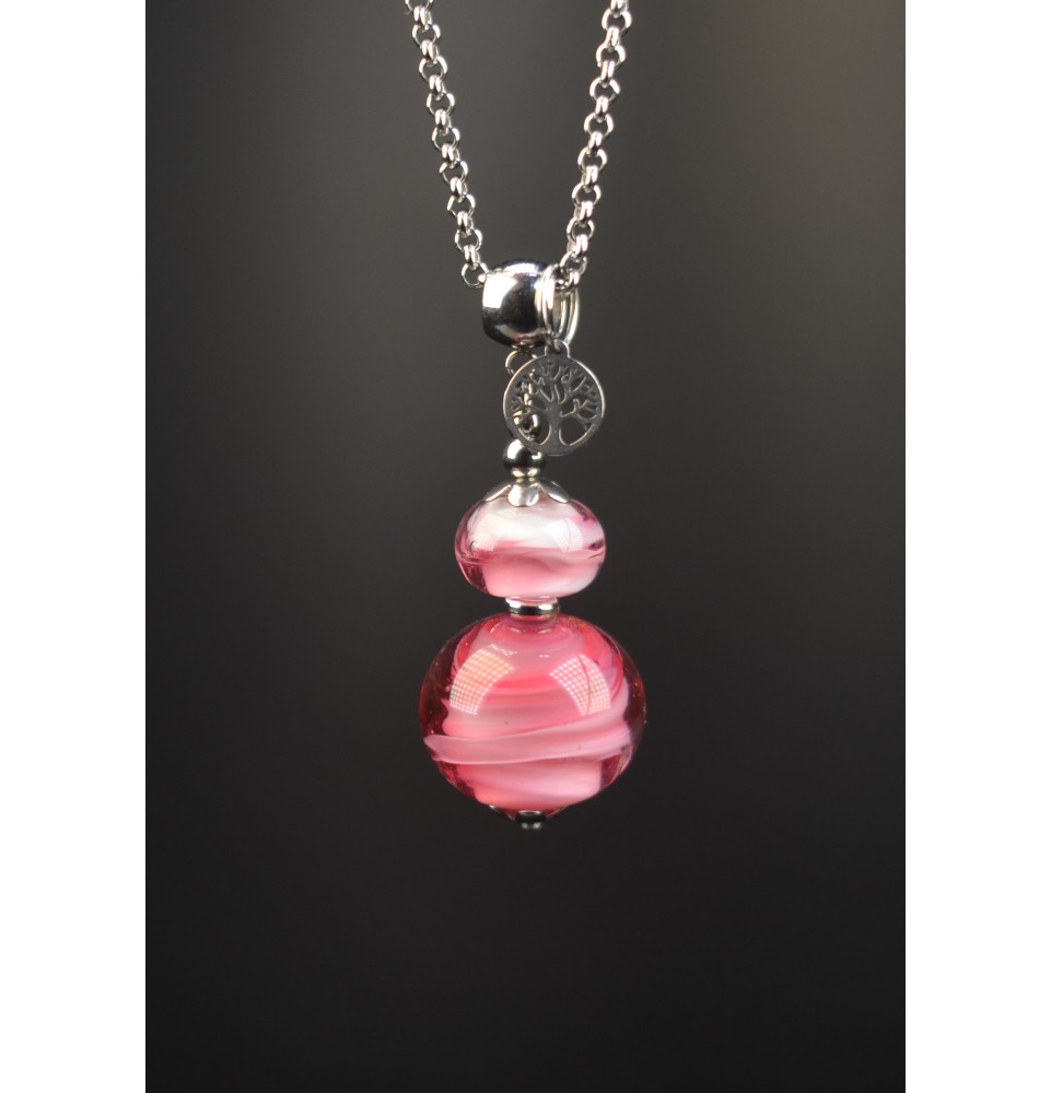 Collier "rose" en Perles de Verre avec Breloque "arbre de vie"