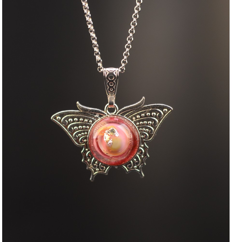 Le pendentif en forme de papillon (5 x 3,2 cm) est orné d’un magnifique cabochon en verre de 2 cm de diamètre, réalisé à la flamme avec un superbe mélange multicolore. Cette couleur chaude et lumineuse rappelle les teintes dorées de l’automne et met en valeur la transparence du verre filé.