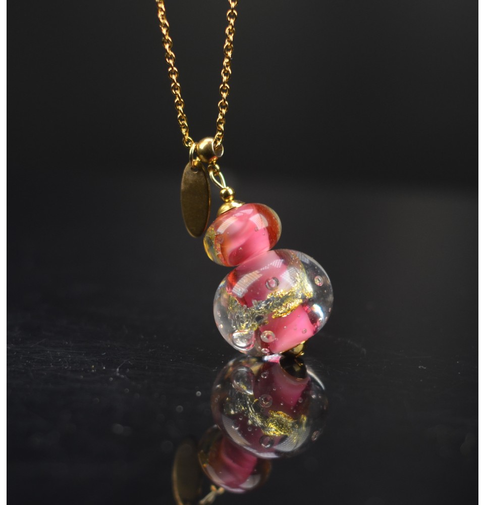 Au centre, une grande perle de verre filée au chalumeau, créée une à une à la flamme, attire tous les regards. D’un diamètre d’environ 2,15 cm, elle révèle un magnifique dégradé rose, avec inclusion de feuille d'or. Chaque nuance se mêle harmonieusement, donnant à la pièce un effet vibrant et organique, totalement unique.