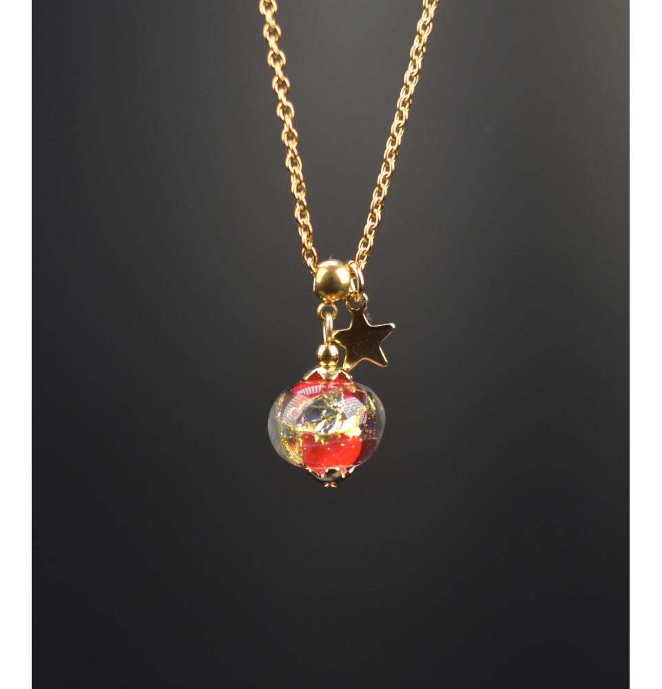 Au cœur du pendentif, une perle de verre rouge de 1,35 cm de diamètre renferme une délicate inclusion de feuille d’or, offrant un éclat raffiné et des reflets chaleureux. Chaque perle est un exemplaire unique, née du travail minutieux du verre en fusion.
