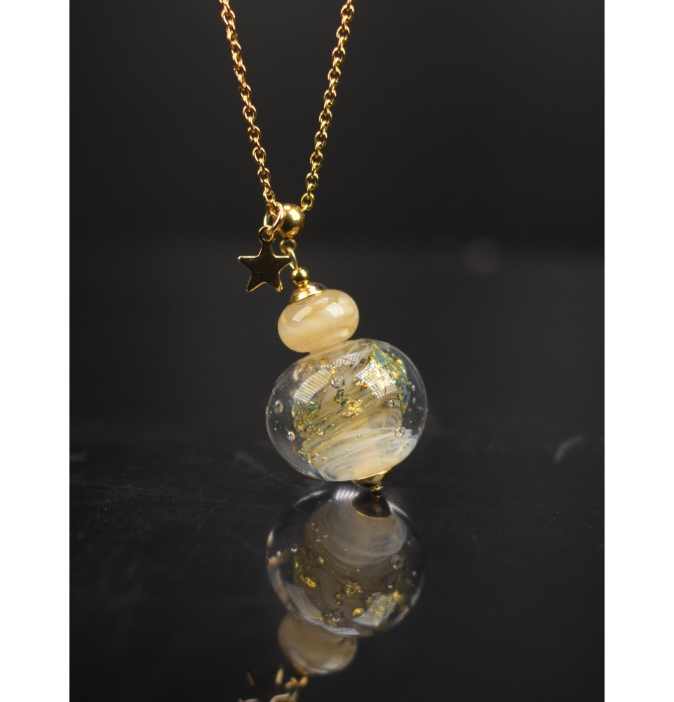 Collier long – Perles artisanales en verre filé, inclusions d’or | Acier inoxydable doré -Pièce unique