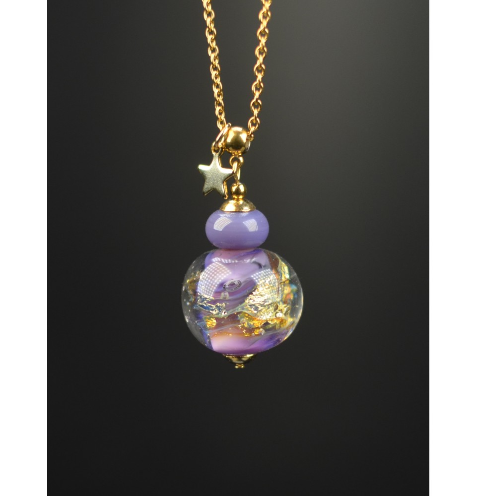 Collier long en perles artisanales en verre filé – VIOLET feuille d’or - ACIER INOXYDABLE doré