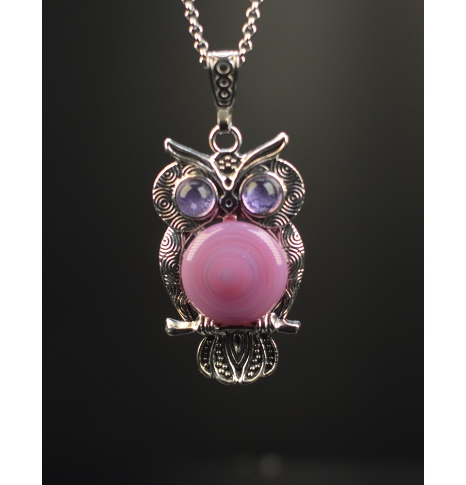 collier hibou 50+ 3 cm "violine rosé" perles de verre filé au chalumeau