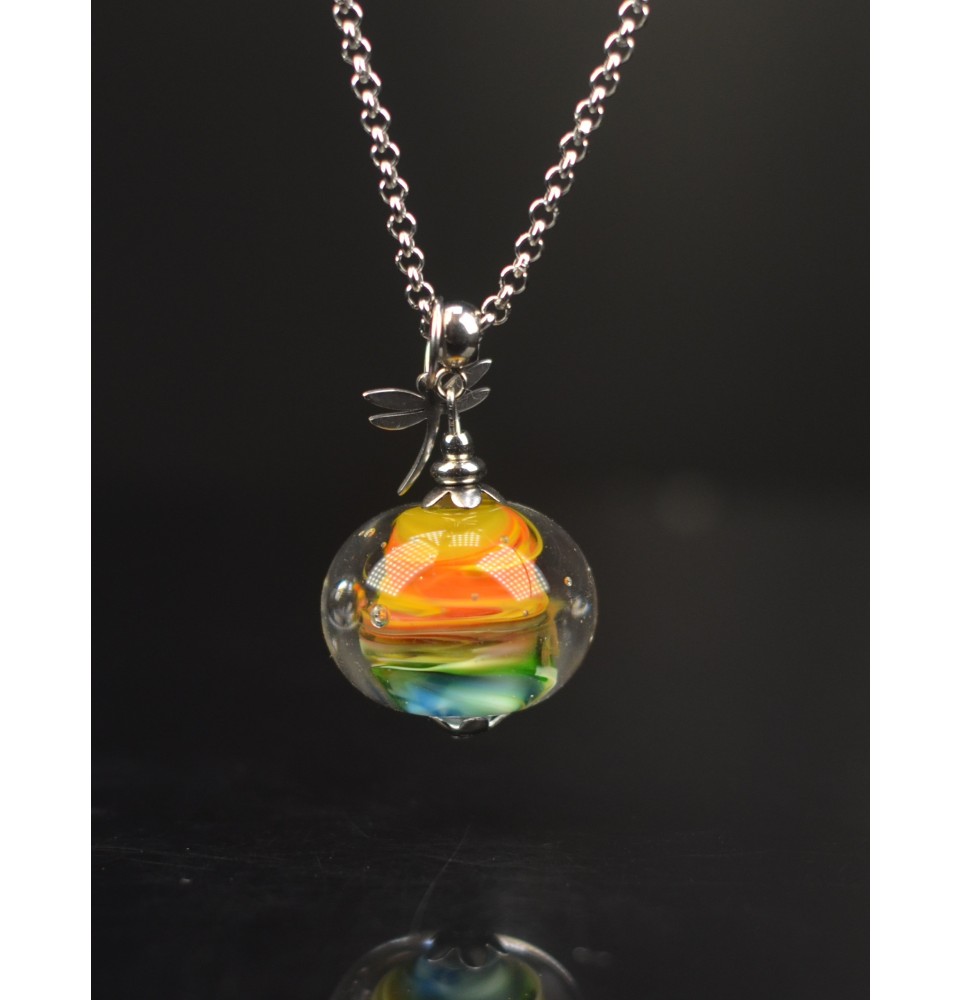 Collier "multicolore" en Perles de Verre et acier inoxydable, breloque LIBELLULE