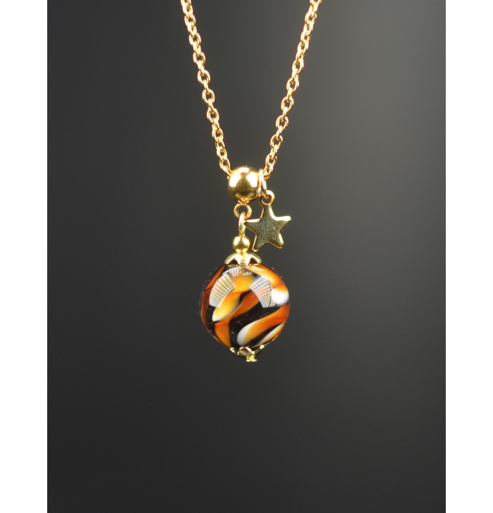 Découvrez le collier court en perle de verre LEOPARD soutenu Liloo Créations. Une création artisanale unique, élégante et colorée, montée sur une chaîne en acier inoxydable doré avec breloque étoile. Fabriqué à la main à Orange.