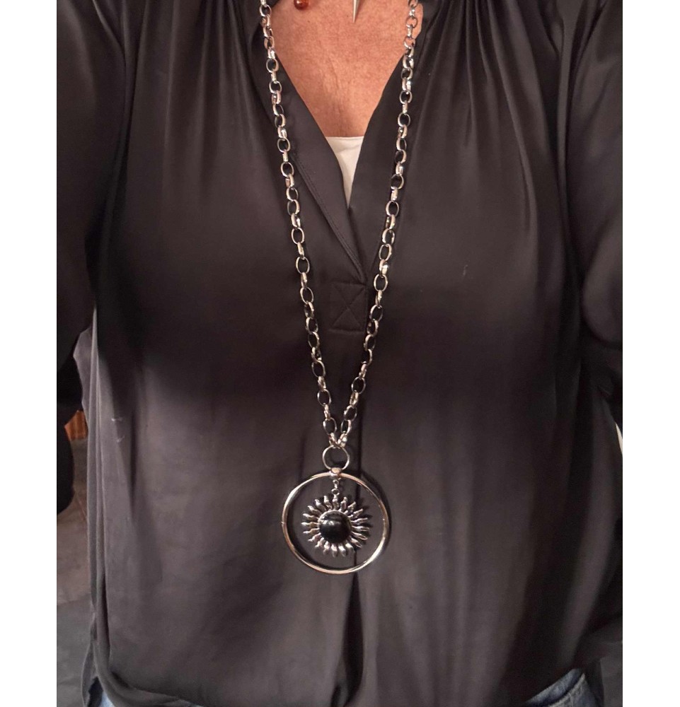 Grand sautoir Soleil en acier inoxydable et verre filé noir – 90 cm