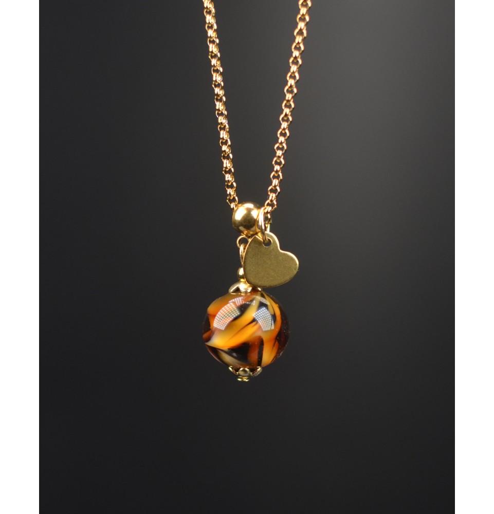 Le collier, en acier inoxydable doré, est monté sur une chaîne délicate de 43 cm + 3 cm avec fermoir mousqueton, pour un confort et un ajustement parfait au quotidien. Chaque pièce est unique, tout comme la perle que vous porterez : aucune n’est identique, et chaque détail témoigne de notre passion pour le verre filé.