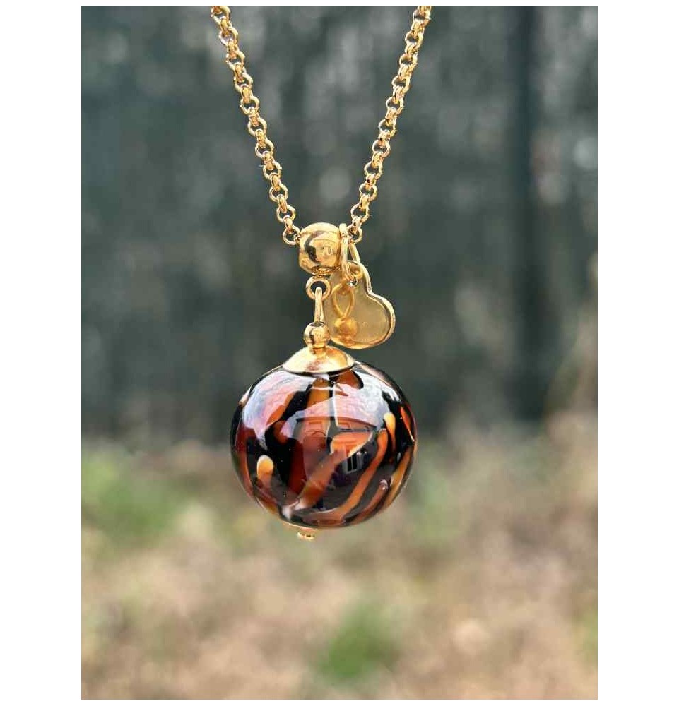 Collier long en acier inoxydable doré, orné d’une grosse perle de verre filée au chalumeau au motif léopard.