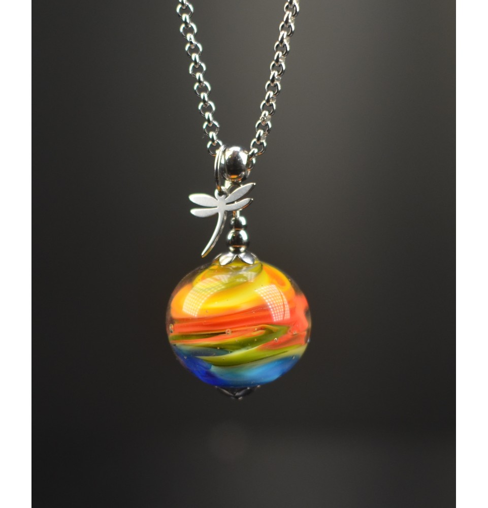 Collier "multicolore" en Perles de Verre et acier inoxydable, breloque LIBELLULE