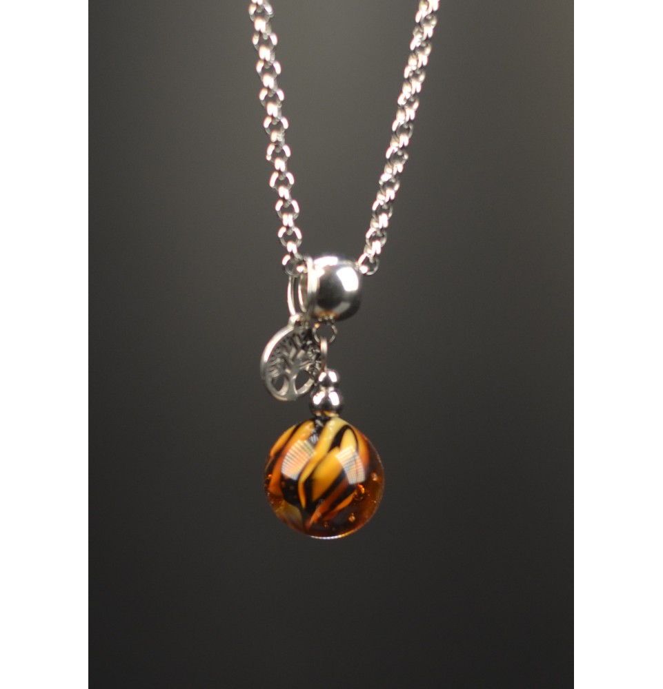 Le collier, en acier inoxydable , est monté sur une chaîne délicate de 44 cm + 3 cm avec fermoir mousqueton, pour un confort et un ajustement parfait au quotidien. Chaque pièce est unique, tout comme la perle que vous porterez : aucune n’est identique, et chaque détail témoigne de notre passion pour le verre filé.