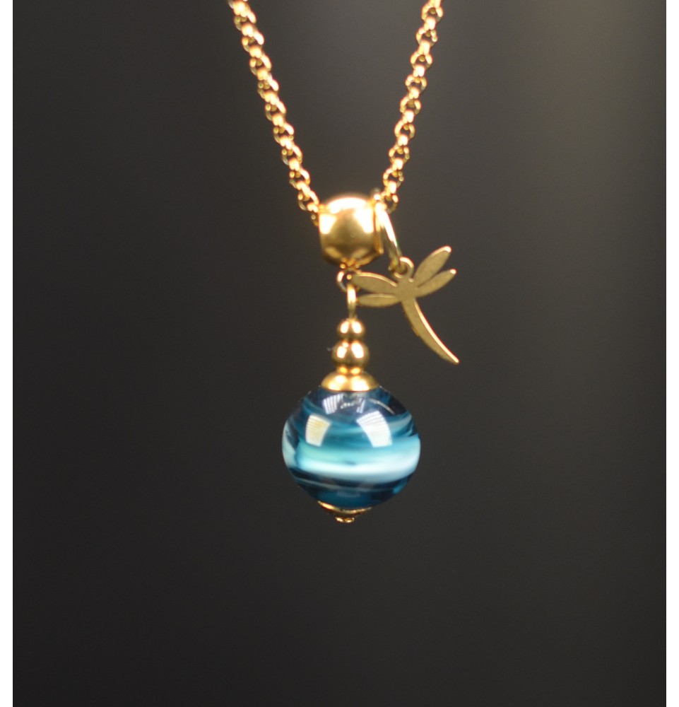 Collier court doré bleu pétrole – Perle de verre artisanale 1,45 cm