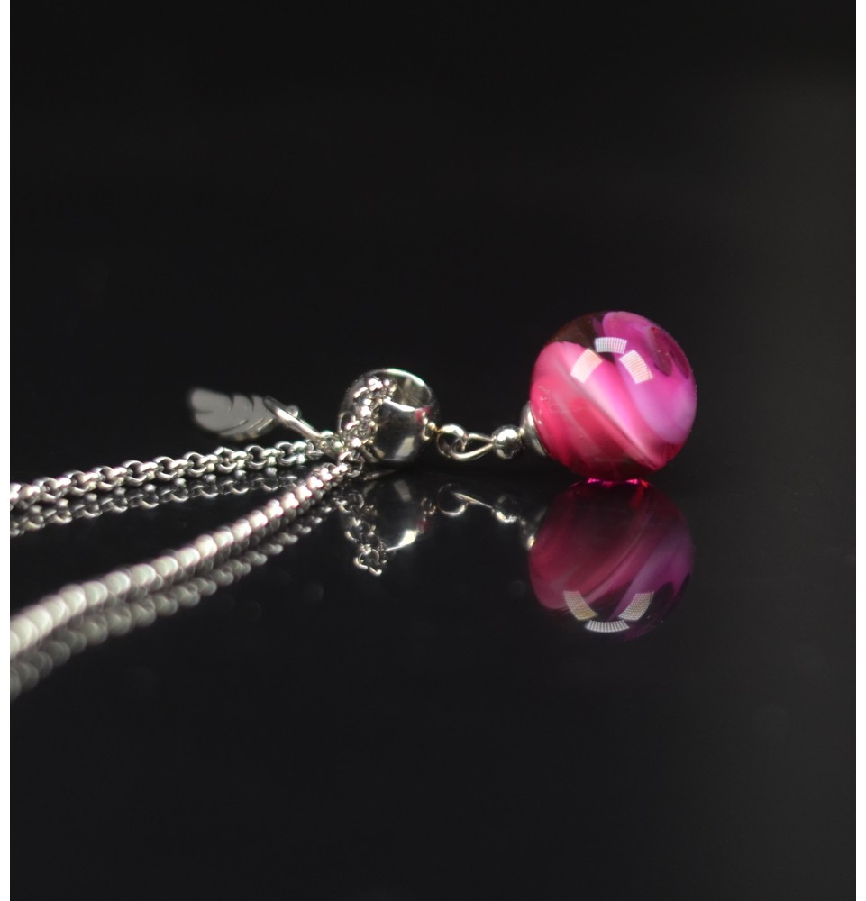 Collier court en acier inoxydable avec perle de verre filé rose et violine (1,35 cm). Longueur 44 cm + 3 cm. Bijou artisanal coloré et unique.