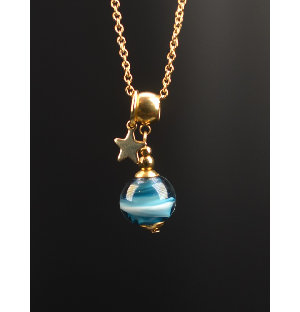 Collier court doré bleu pétrole – Perle de verre artisanale 1,45 cm