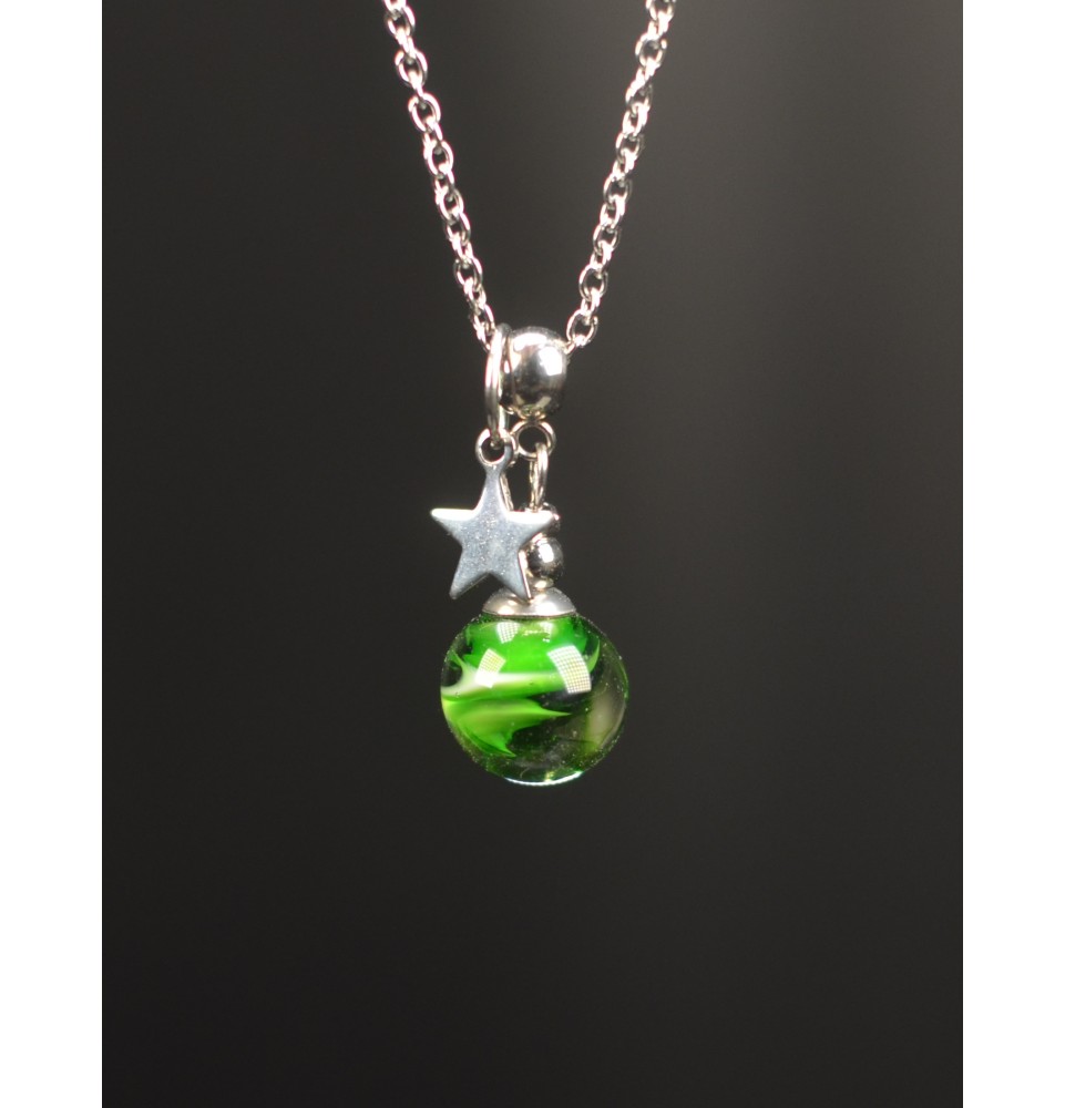 Au cœur de ce bijou se dévoile une perle de verre filée au chalumeau, entièrement réalisée par l’artisane. Sa teinte VERT ROSETTA , à la fois douce et vibrante, capte la lumière et apporte une touche de fraîcheur et de poésie à votre tenue. Chaque perle est unique, façonnée une à une, ce qui rend ce collier absolument singulier.
