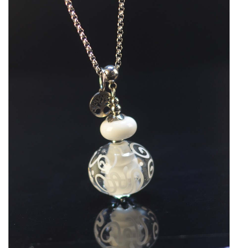 Collier long 70 cm en acier inoxydable avec pendentif en perles de verre filé artisanales.