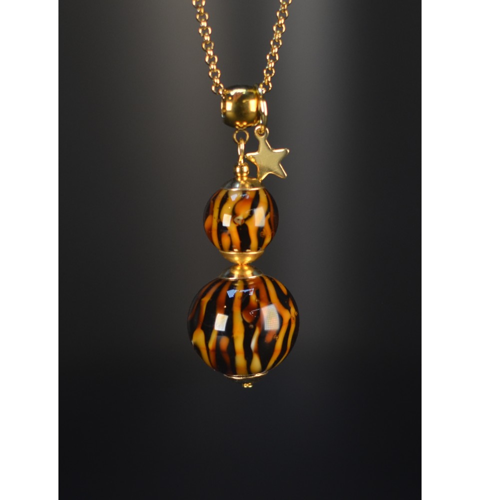 Collier long en acier inoxydable doré, orné d’une grosse perle de verre filée au chalumeau au motif léopard.