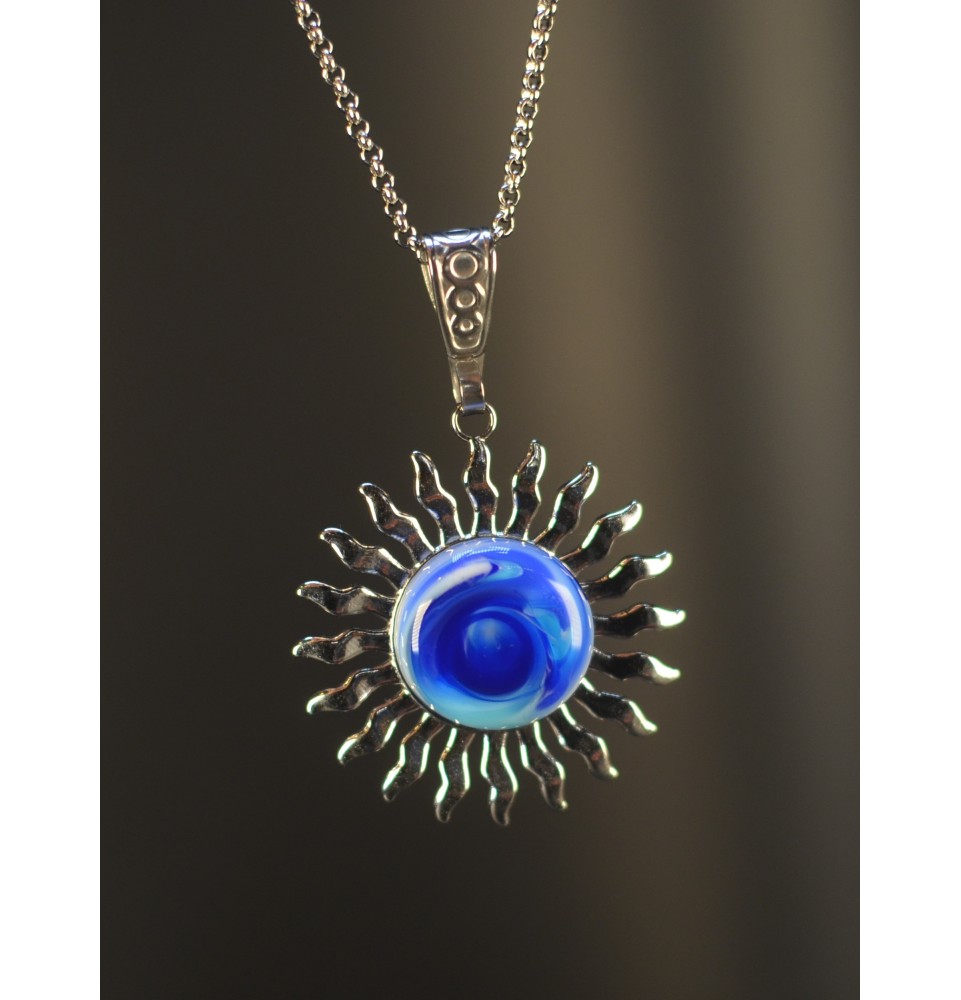 Collier Soleil 3,5 cm avec cabochon en verre filé bleu deux tons, façonné à la main en France. Bijou artisanal unique sur chaîne inoxydable réglable.