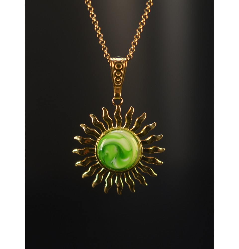 Collier Soleil – Cabochon en verre VERT - ACIER INOXYDABLE DORE