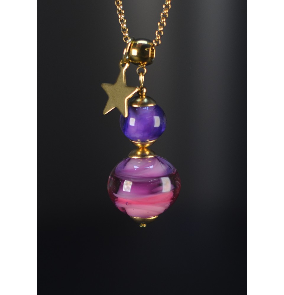 Le verre filé au chalumeau est un véritable savoir-faire artisanal. Chaque perle est unique : les nuances, les effets de matière et les subtilités du dégradé rendent votre collier absolument exclusif.