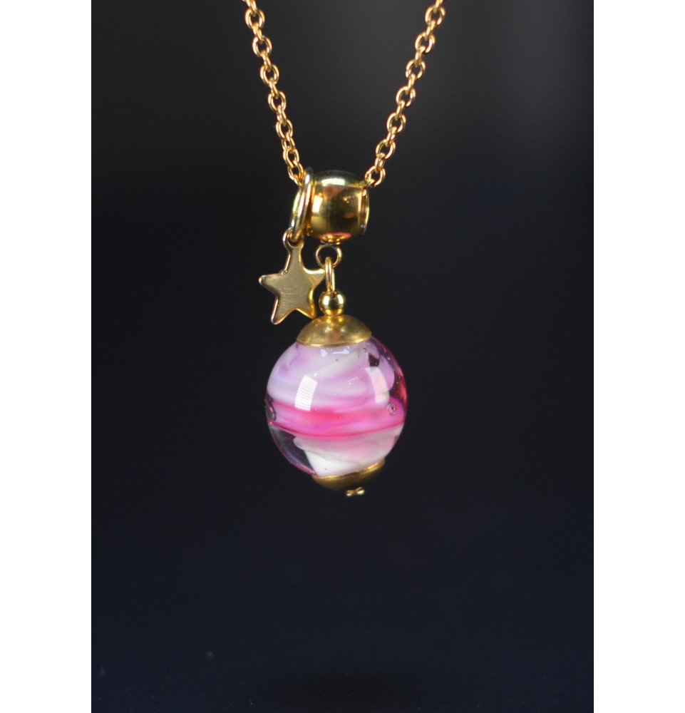 Collier court en acier inoxydable doré & perle de verre rose blanc, imaginé et façonné à la main dans l’atelier Liloo Créations, à Orange.