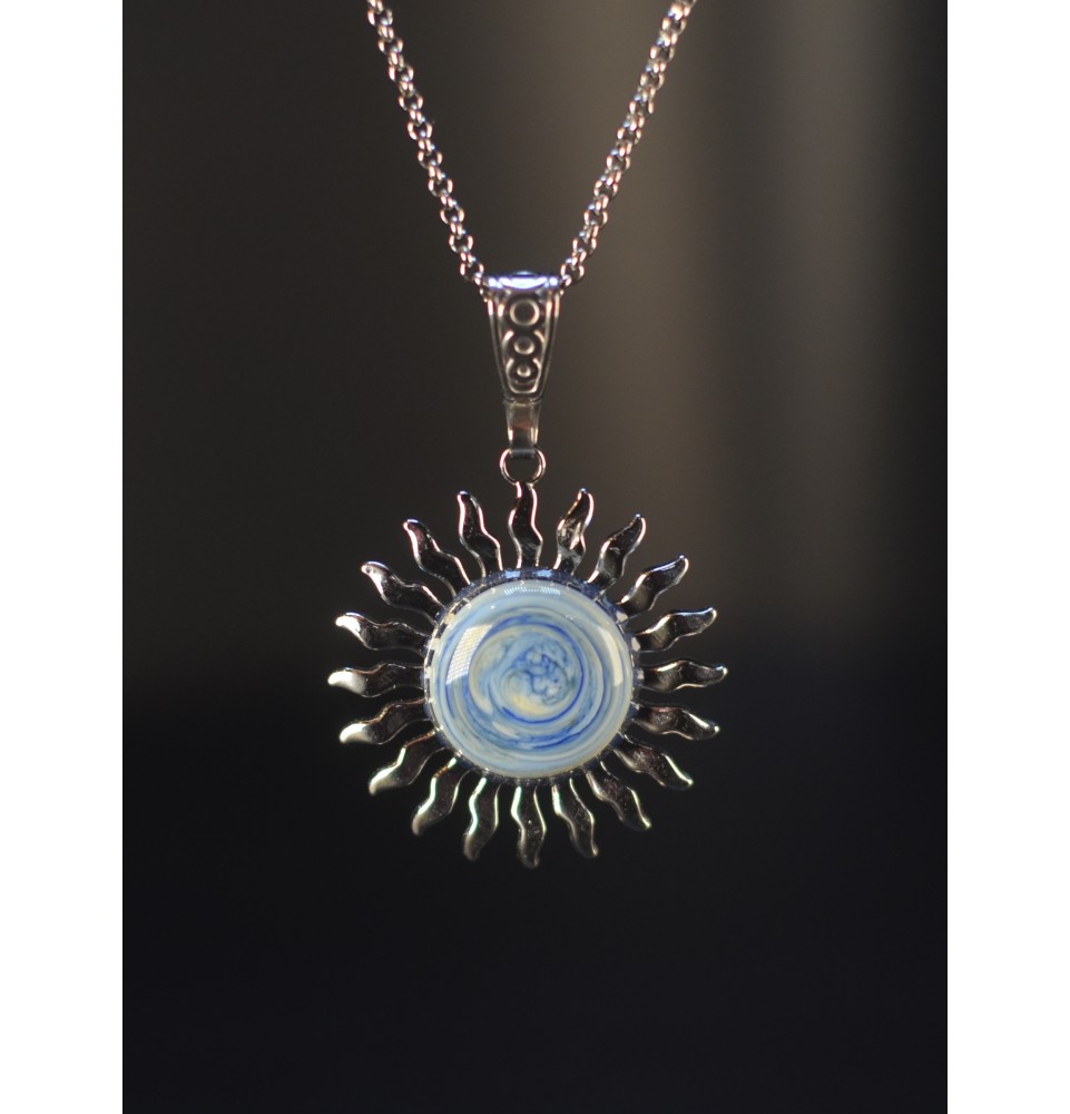 Collier Soleil 3,5 cm avec cabochon en verre filé bleu deux tons, façonné à la main en France. Bijou artisanal unique sur chaîne inoxydable réglable.