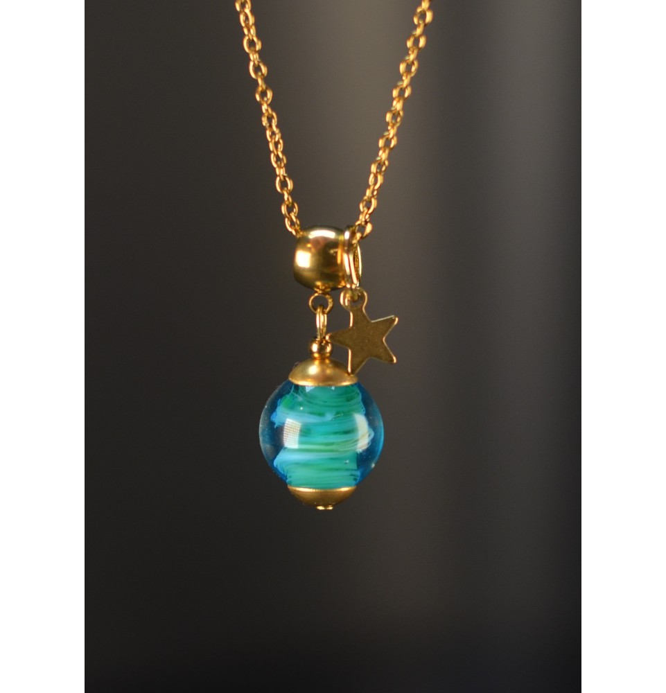 Collier artisanal BLEU VERT Liloo Créations - perles de verre filé - acier inoxydable doré