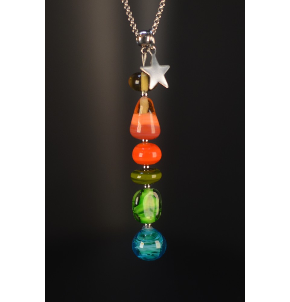 Collier "Éclat de Joie" avec chaîne en acier inoxydable 70 cm et pendentif multicolore en 7 perles de verre filé. Un bijou artisanal lumineux, aux couleurs éclatantes et aux formes variées, qui apporte une vraie touche de joie à votre tenue.