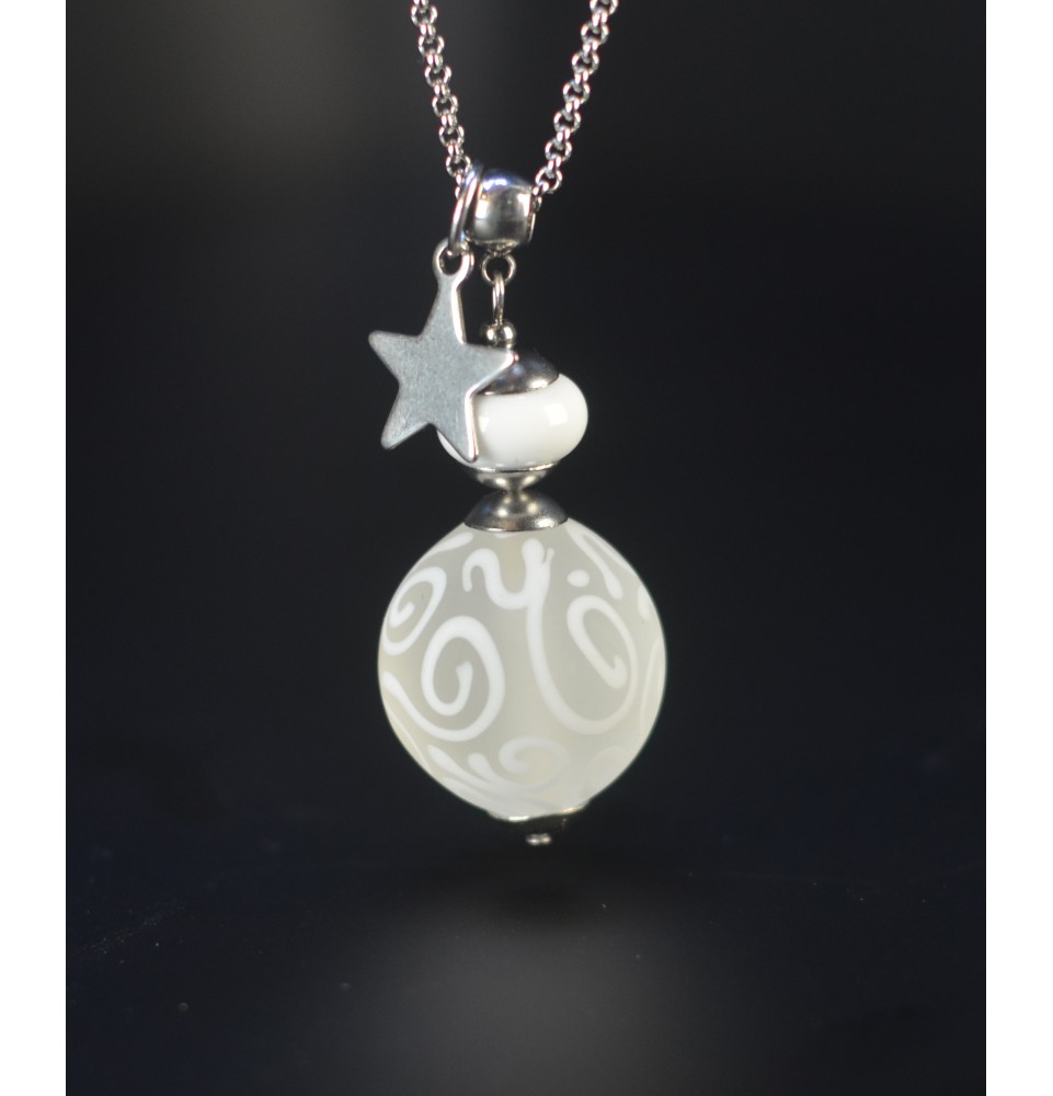 Collier long en acier inoxydable de 70 cm avec une perle en verre filé blanc mat dépolie ornée de motifs arabesques. Une pièce artisanale unique, élégante et moderne.