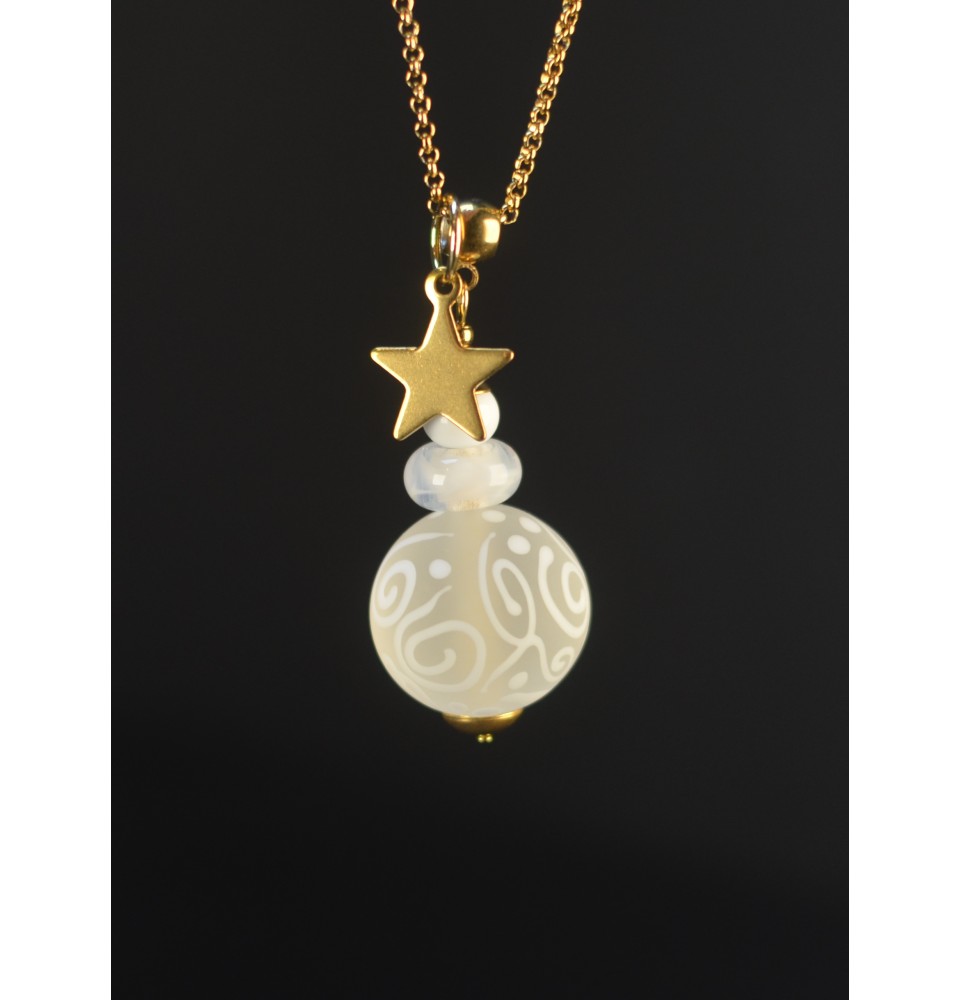 Collier Long Perle Dépolie Blanche à Arabesques – Verre Filé Artisanale – Acier Inoxydable doré – 75 cm