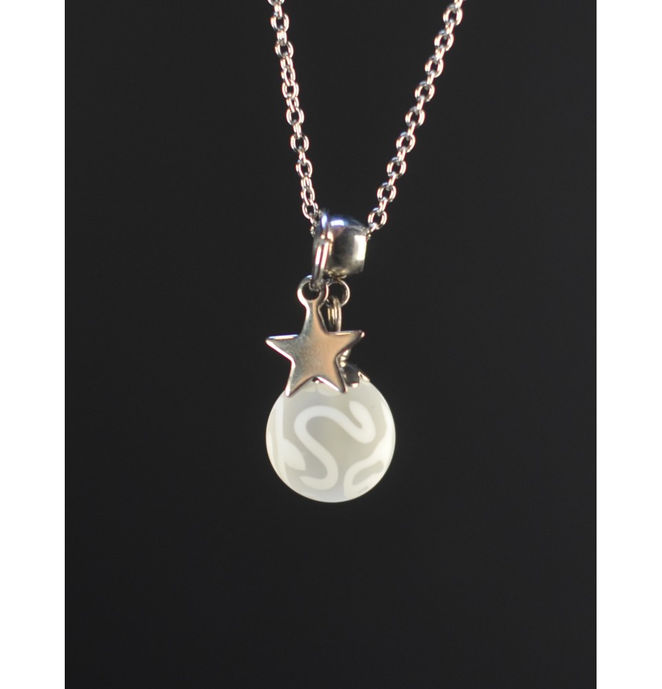 Collier court en acier inoxydable (45 cm + 3 cm) orné d’une perle de verre filée au chalumeau de 1,2 cm. Sa teinte blanc mate, , en fait une création artisanale unique en quantité limitée.