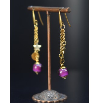 20,00 €Boucles d’oreilles en verre filé violine artisanal (Ø 1 cm) montées sur crochets en acier inoxydable doré avec breloque étoile.