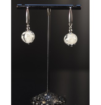 20,00 €Boucles d’oreilles artisanales en perles de verre filé blanches. Hauteur 4 cm, perles 1,2 cm. Acier inoxydable argenté.