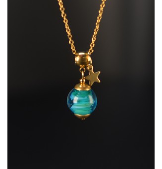 25,00 €Collier Soleil 3,5 cm avec cabochon en verre filé bleu deux tons, façonné à la main en France. Bijou artisanal unique sur chaîne inoxydable réglable.