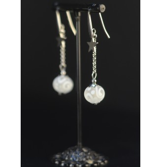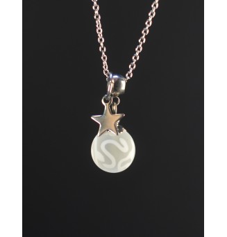 28,00 €Collier long en acier inoxydable de 70 cm avec une perle en verre filé blanc mat dépolie ornée de motifs arabesques. Une pièce artisanale unique, élégante et moderne.