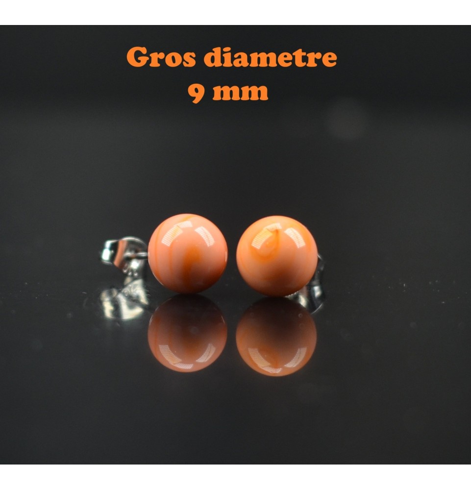 puces d'oreilles Gros diametre, ABRICOT 9 mm Acier Inoxydable en verre